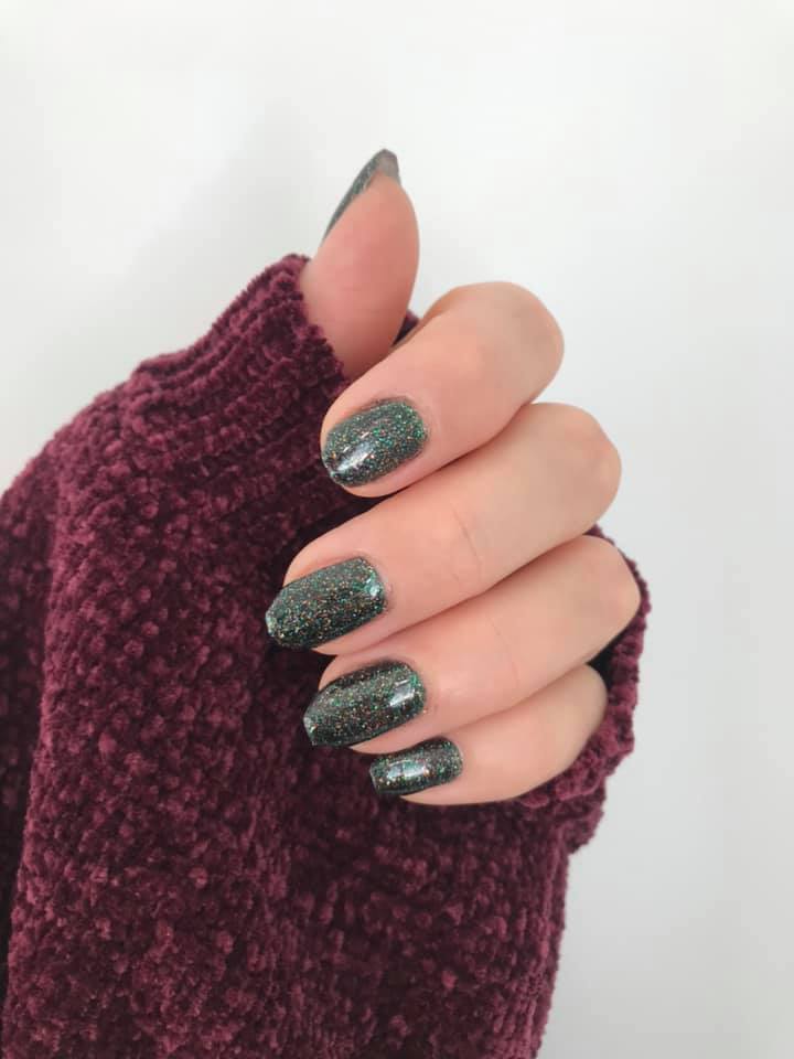 This black-tinted polish twinkles with multicolour sparkles.