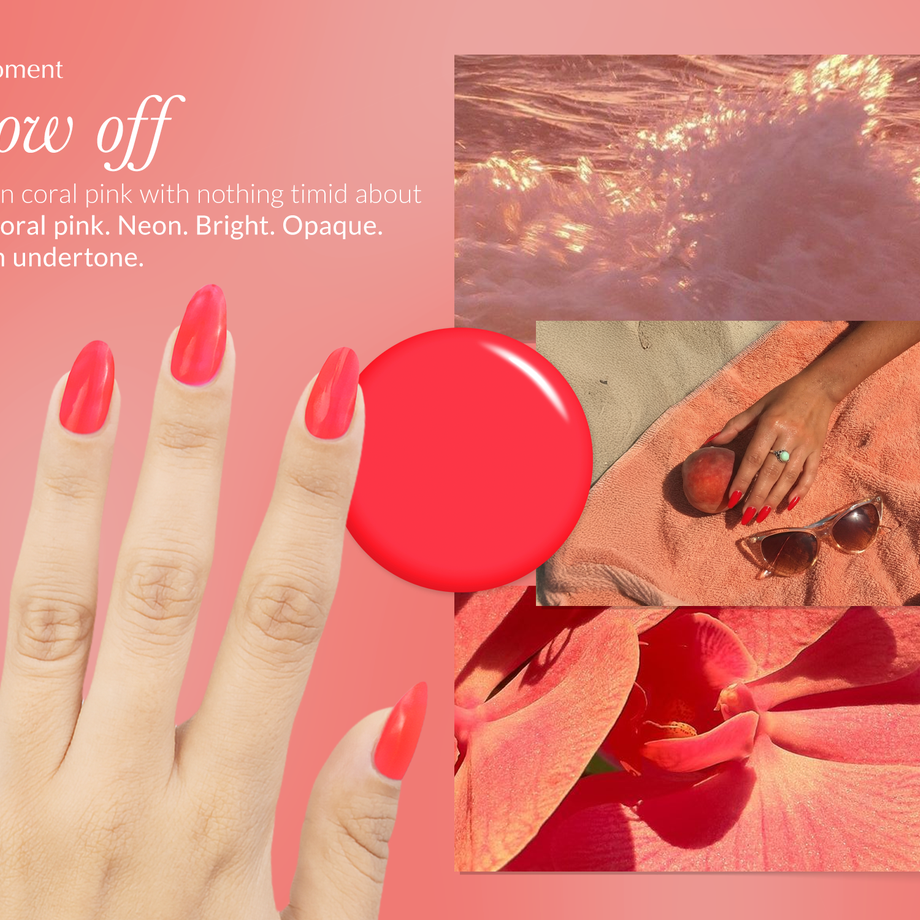 Coral pink. Neon. Bright. Opaque. Warm undertone.